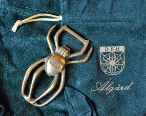 Ålgård Rotary selger både historieboken "Ålgård i 150 År" og replika av DFU sin spinnekjerring - en flaskeåpner i messing.